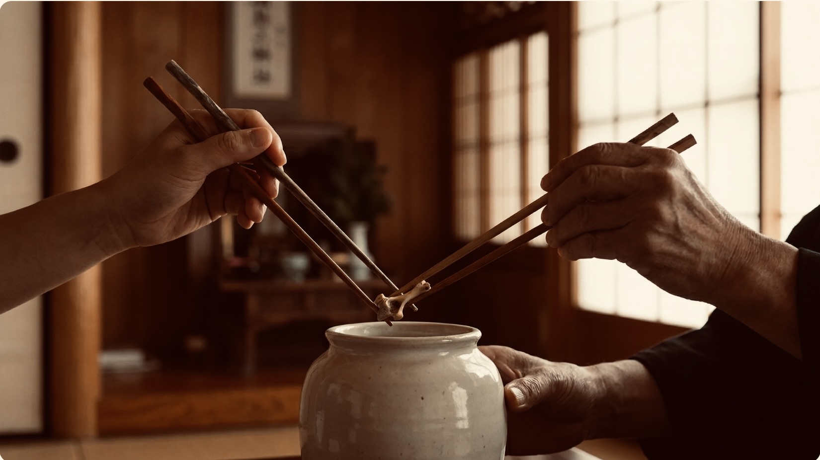 The point of Kotsuage I presume is that everyone takes their time and talks, I would hope with fondness, about the recently passed away relative. It’s their form of remembrance. I’d remember my grandparent acutely too if I had to place a toe bone into an urn.